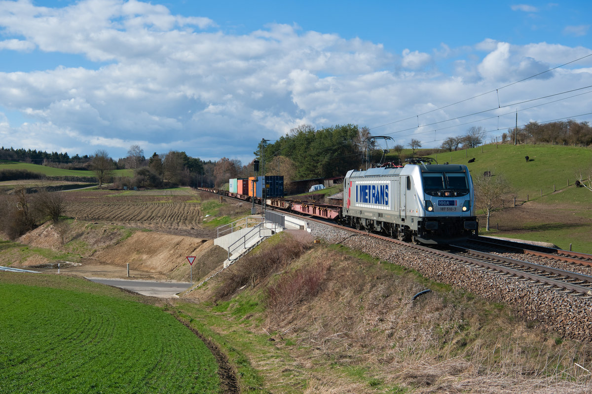 187 510 mit einem fast leeren Containerzug bei Fahlenbach Richtung München, 18.03.2019