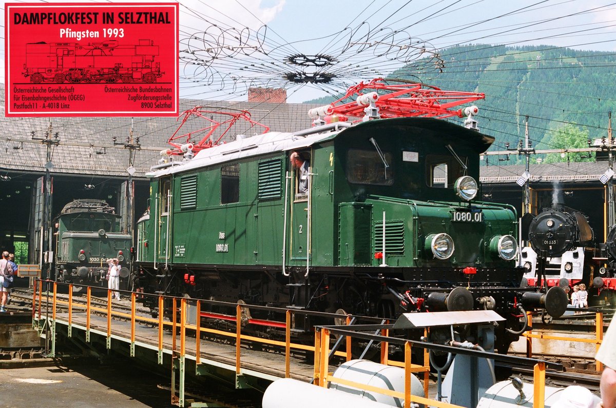 30.05.1993, „Dampflokfest in Selzthal“, Natürlich war auch die in Österreich stark vertretene E-Traktion mit von der Partie. E-Lok 1080.01 präsentiert sich auf der Drehscheibe