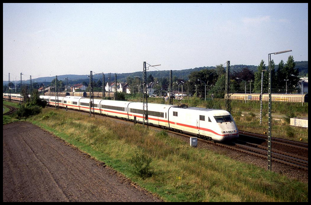 Der ICE 401514 hat hier am 3.9.2004 gerade den Bahnhof Lengerich in Westfalen durchfahren und ist nun auf dem Weg zum nächsten Halt in Münster HBF.