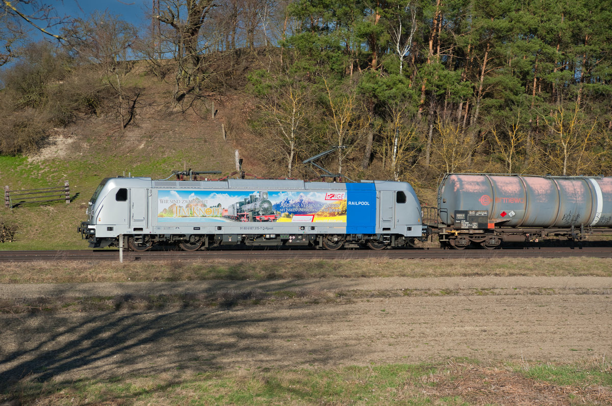 Detailaufnahme von 187 315 "Jim Knopf" der IGE, die mit einem Kesselwagenzug bei Fahlenbach Richtung Ingolstadt unterwegs ist, 18.03.2019