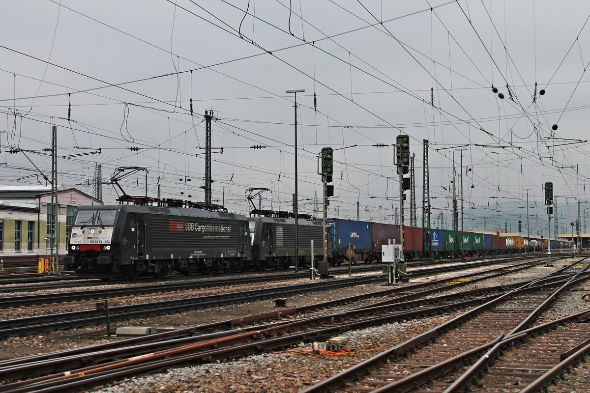 Durchfahrt am 23.02.2018 von MRCE/SBBCI ES 64 F4-083 (189 983-0) "SBB Cargo International" und MRCE/SBBCI ES 64 F4-207 (189 207-4) zusammen mit dem DGS 40030 (Melzo Scalo - Rottderdam Waalhaven) über Gleis 4 durch den Badischen Bahnhof von Basel in Richtung Deutschland.
