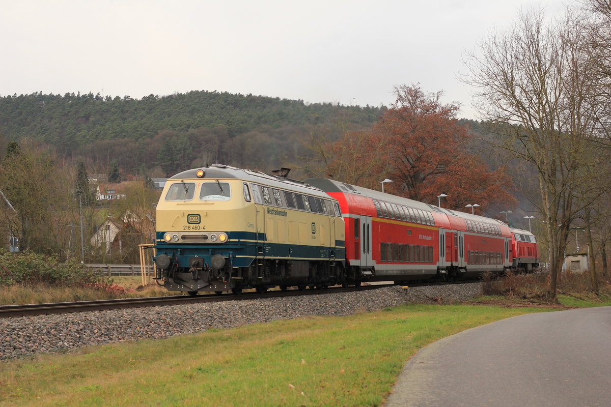 Im Winter 2017/2018 verlieh die Westfrankenbahn einige VT 642 an die Kurhessenbahn. Diese wurden kurzerhand durch ein 218-Sandwich mit Dostos ersetzt. Hier verlässt die von 218 460 angeführte Fuhre am 29.12.2017 den Haltepunkt Laudenbach (b. Kleinheubach). Am Zugschluss befindet sich 218 430. Kleiner Funfakt am Rande: Da die beiden Lokomotiven teilweise Schwierigkeiten hatten die Fahrzeiten der Wanderdünen zu halten, wies der TF die Fahrgäste stetes auf beschleunigtes Aussteigen hin.