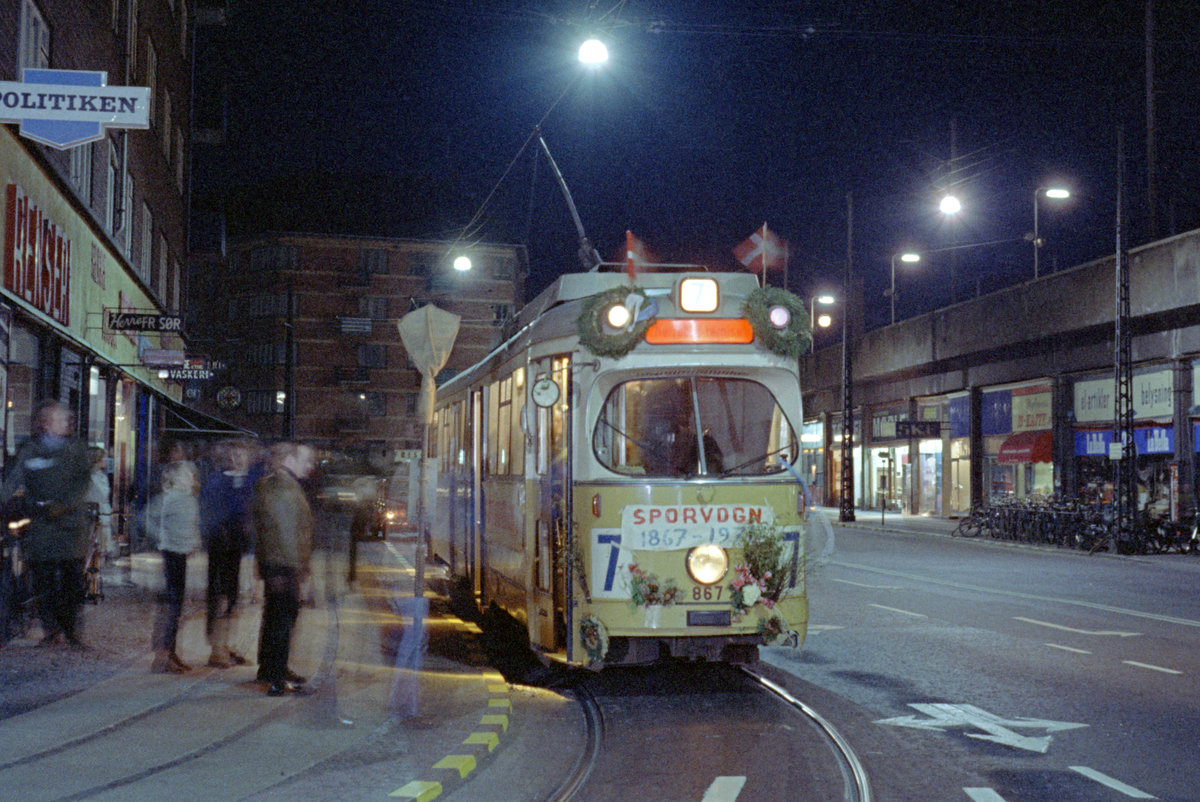 København / Kopenhagen Københavns Sporveje: Der letzte Zug der SL 7 (DÜWAG/Kiepe-GT6 867) hält in der Nørrebrogade, bereit, in den Betriebsbahnhof Nørrebro hineinzufahren. Datum: 25. April 1971, kurz nach Mitternacht. - Nach der Umstellung der SL 7 auf Dieselbusbetrieb gab es nur noch eine Straßenbahnlinie in Kopenhagen, die Linie 5. - Scan eines Farbnegativs. Film: Kodak Kodacolor X.