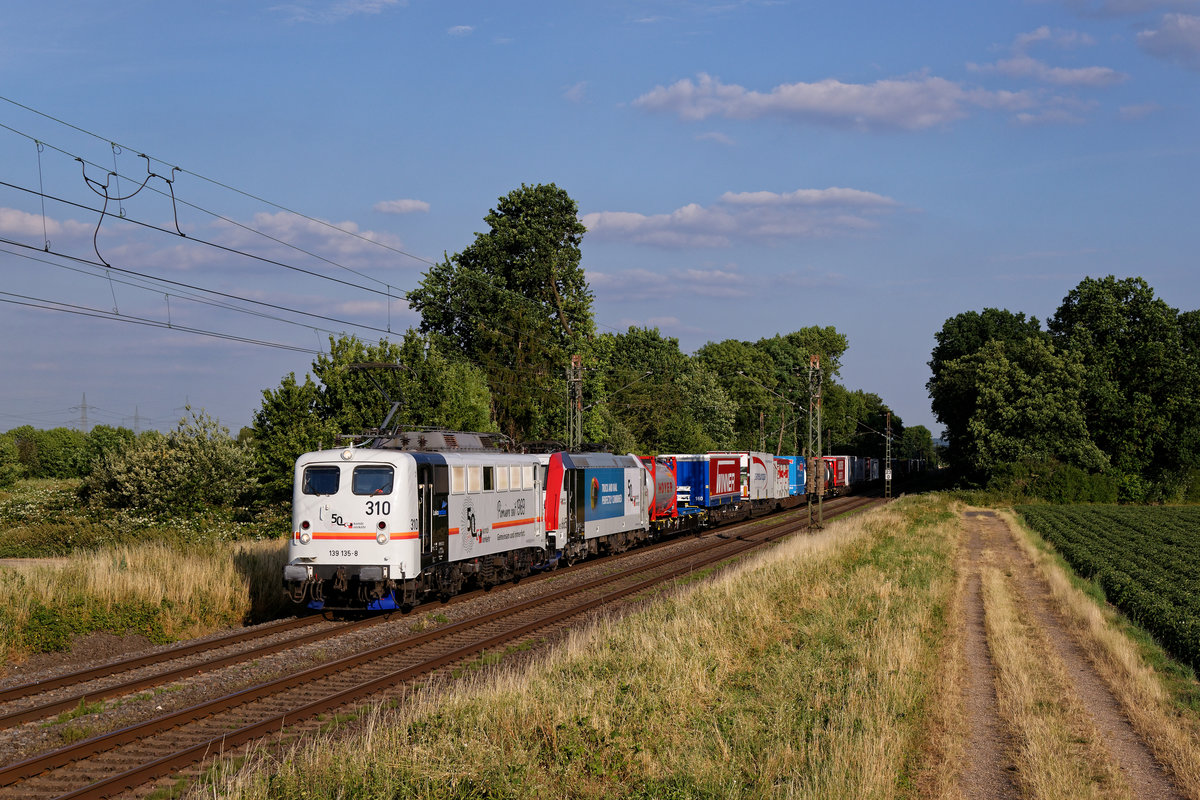 LM 139 135 mit GA 185 665 und einem Sonderzug anlässlich des 50. Jubiläum der Kombiverkehr KG in Bornheim (Rhld.), 01.07.2019.
