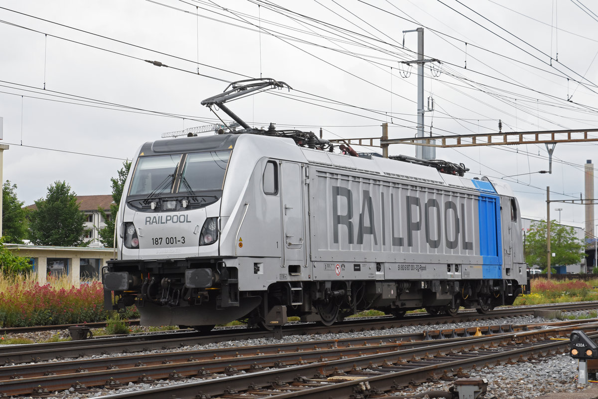 Lok 187 001-3 durchfährt solo den Bahnhof Pratteln. Die Aufnahme stammt vom 11.06.2019.