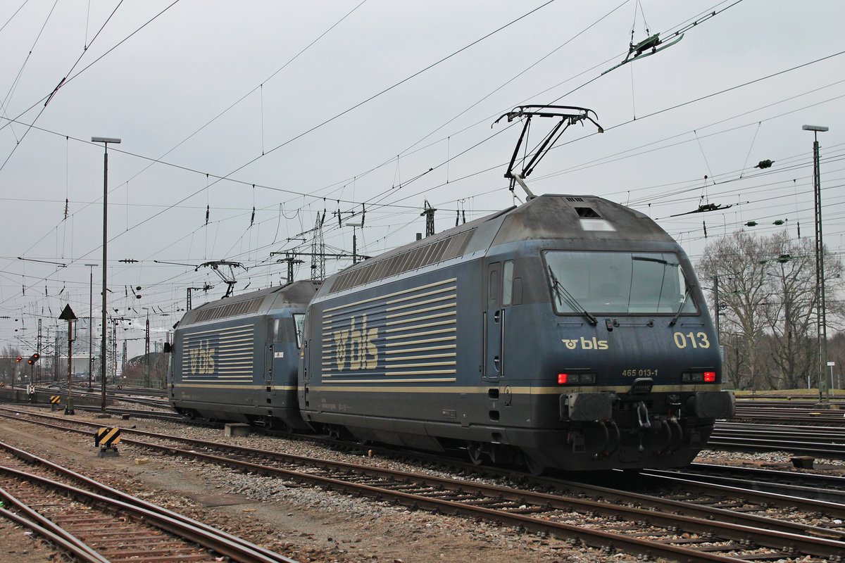 Nachschuss auf Re 465 013-1 "Stockhorn", als diese am Nachmittag des 23.02.2018 zusammen mit Re 465 011-5 "Wisenberg" als Lokzug aus dem Bvadischen Bahnhof von Basel in Richtung Basel Bad Rbf fuhren, um dort einen Güterzug gen Süden zu bespannen.