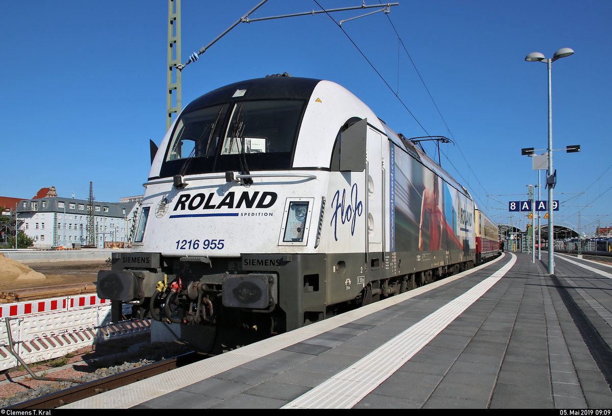 Portrait von 1216 955-5 (Siemens ES64U4) der Wiener Lokalbahnen Cargo GmbH (WLC), mit Werbung für den Transportpartner Roland Spedition GmbH, als AKE 50 (AKE-RHEINGOLD-Sonderzug) von Cottbus Hbf nach Wien Westbahnhof (A), der in Halle(Saale)Hbf auf Gleis 8 steht.