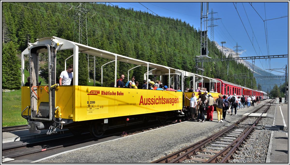 R1641 nach Tirano führt am Zugschluss zwei offene Panoramwagen, hier beim Halt in Cavaglia. (25.06.2019)