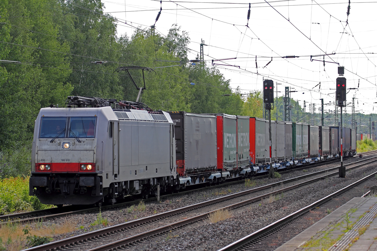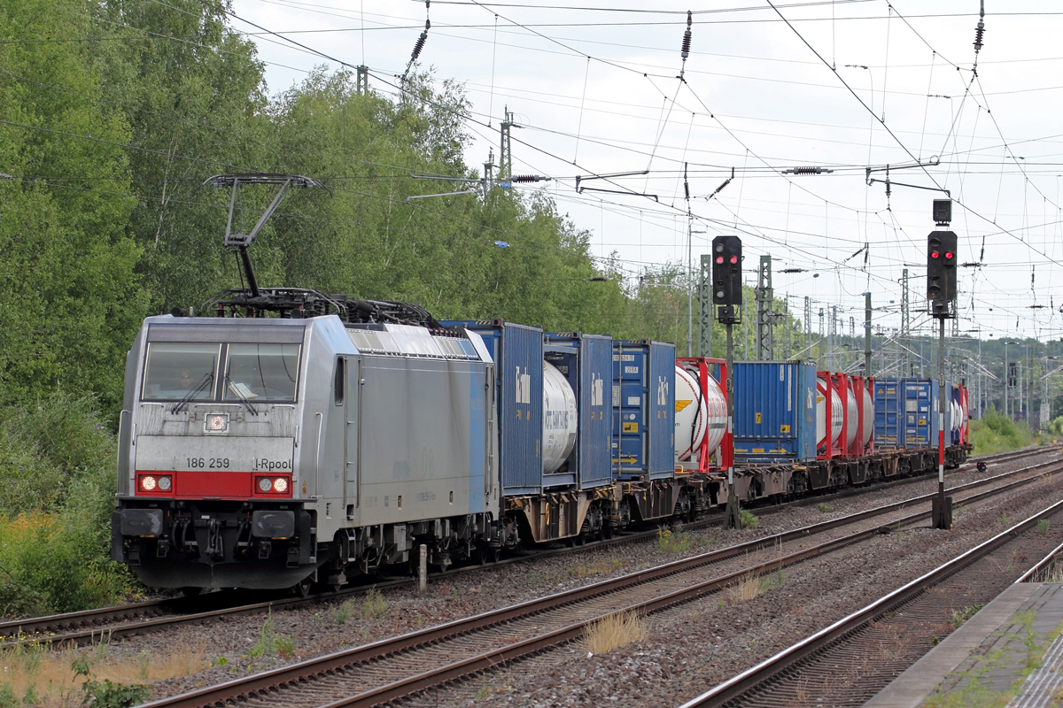 186 497-4 von Lineas/Railpool kommt aus Richtung Aachen-West auf dem falschen Gleis mit einem Coilzug aus Kinkempois(B) nach Köln-Gremberg(D) und kommt aus Richtung Aachen-West und