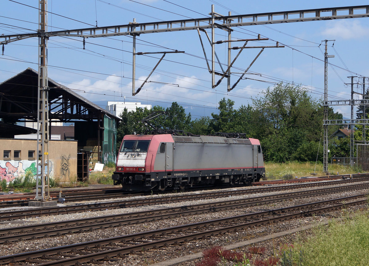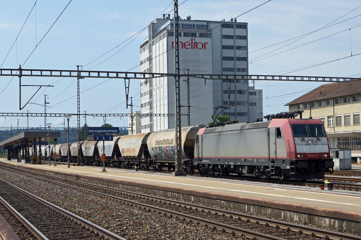 Die graue/margenta farbene ex Crossrail 185 591-5 holte am 2. Juli 2019 in Herzogenbuchsee den Leermaterialzug ab.