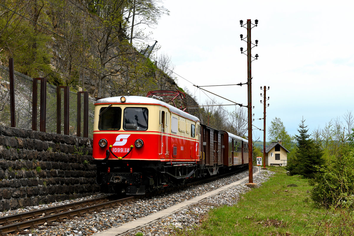 Vom Portal des Ameiskogeltunnels konnte die als 1099.14 beschriftete E14 der NÖVOG mit ihrem Sonderzug auf dem Gösinggrabenviadukt fotografiert werden. Hier hängt die alte Telegraphenleitung sogar noch (11. Mai 2019).
