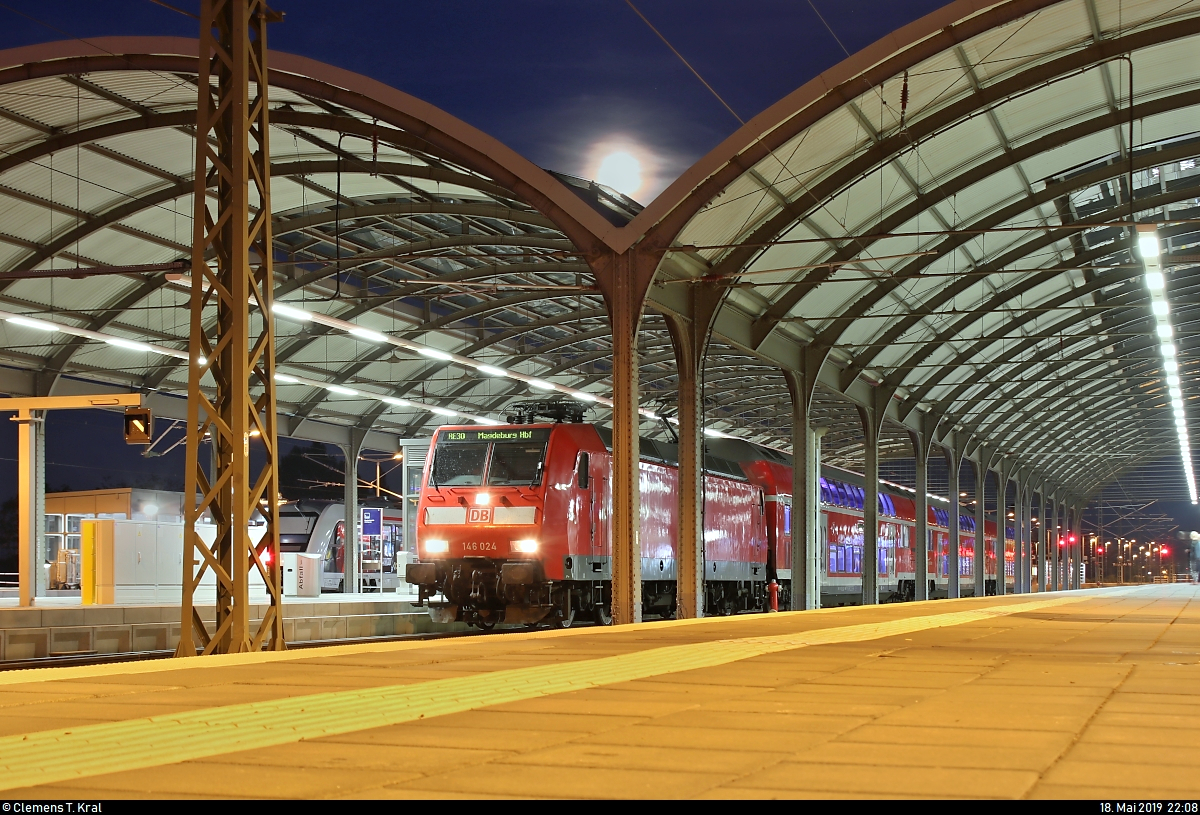Langzeitbelichtung mit Mondlicht von 146 0?? der Elbe-Saale-Bahn (DB Regio Südost) als RE 16336 (RE30) nach Magdeburg Hbf, der seinen Startbahnhof Halle(Saale)Hbf auf Gleis 10 E-G.