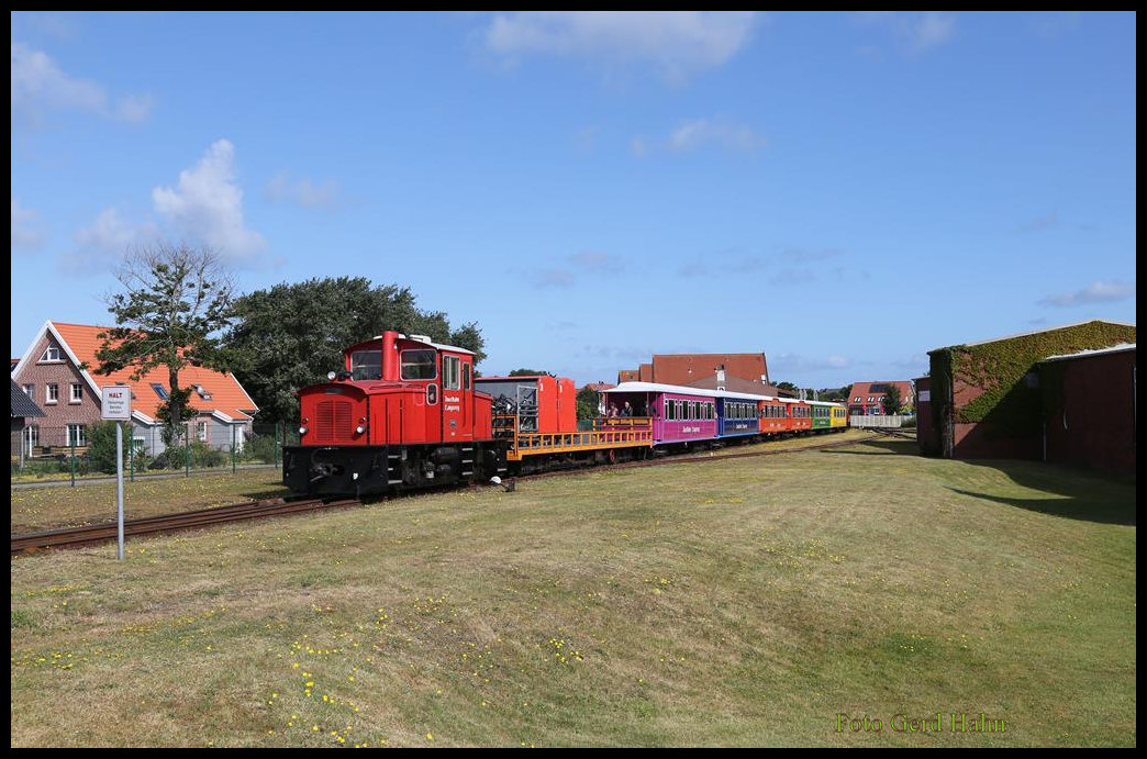 Am 3.7.2019 fotografierte ich diesen Personenzug auf der Insel Langeoog. Er wurde im "Sandwich" von zwei Schoema Lokomotiven gefahren. Bei diesem Nachschuss war Lok 5 im Vordergrund. Lok 1 war an der Spitze des Zuges.