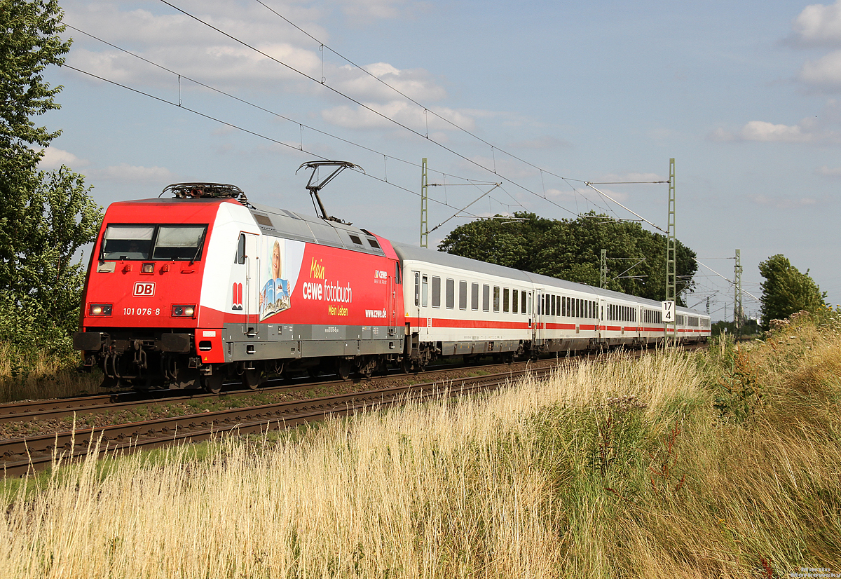 101052-9 ist hier am 5.7.2019 um 12.45 Uhr mit ihrem IC am Ortsrand von Hasbergen auf der Rollbahn nach Stuttgart unterwegs.