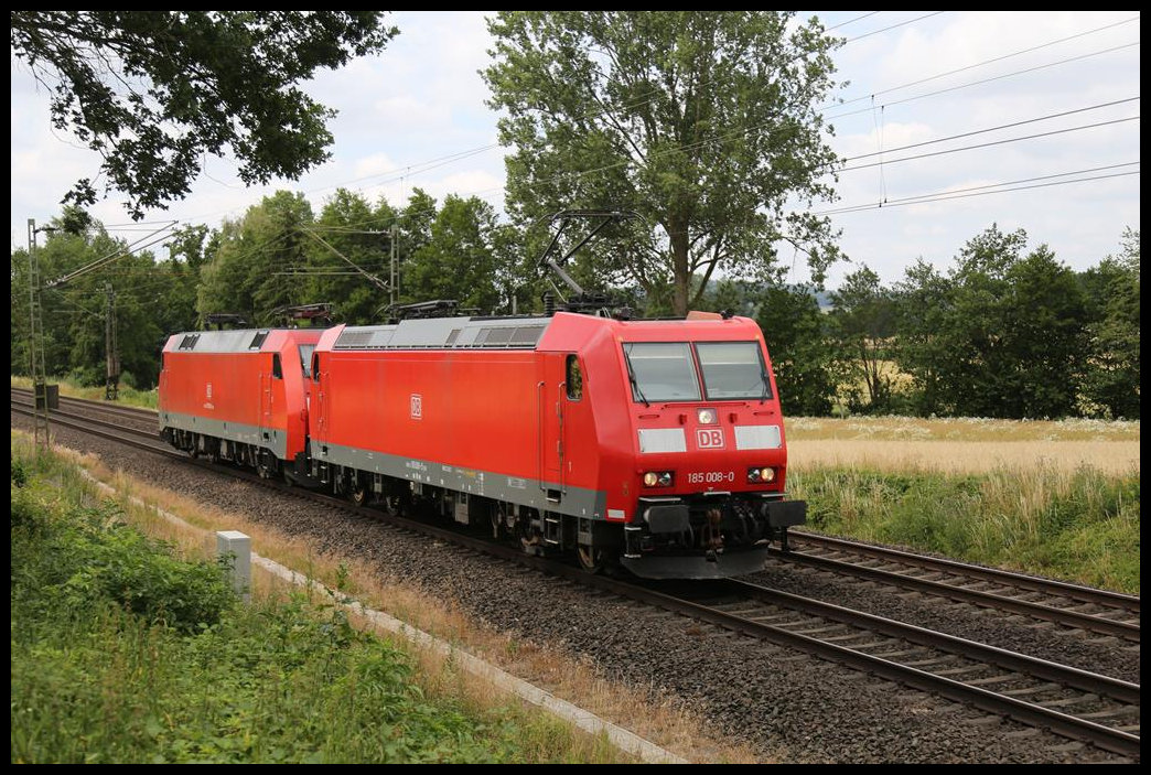 185008-0 und 152091-5 kamen am 5.7.2019 als Lok Zug über die Rollbahn. Um 11.50 Uhr erreichten sie aus Münster kommend den Ortsrand von Hasbergen.