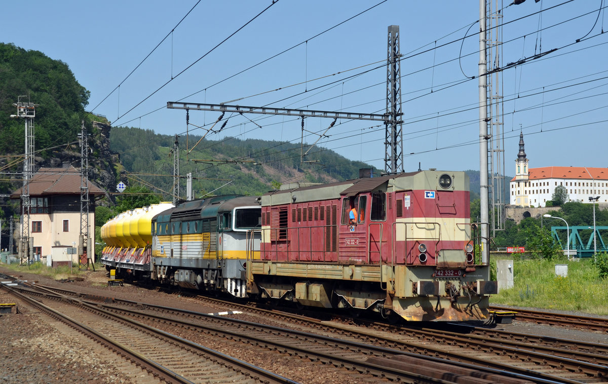 742 332 schleppte am 12.06.19 einen kurzen Güterzug und 753 301 vom Rangierbahnhof Decin-vychod kommend durch den Bahnhof Decin.