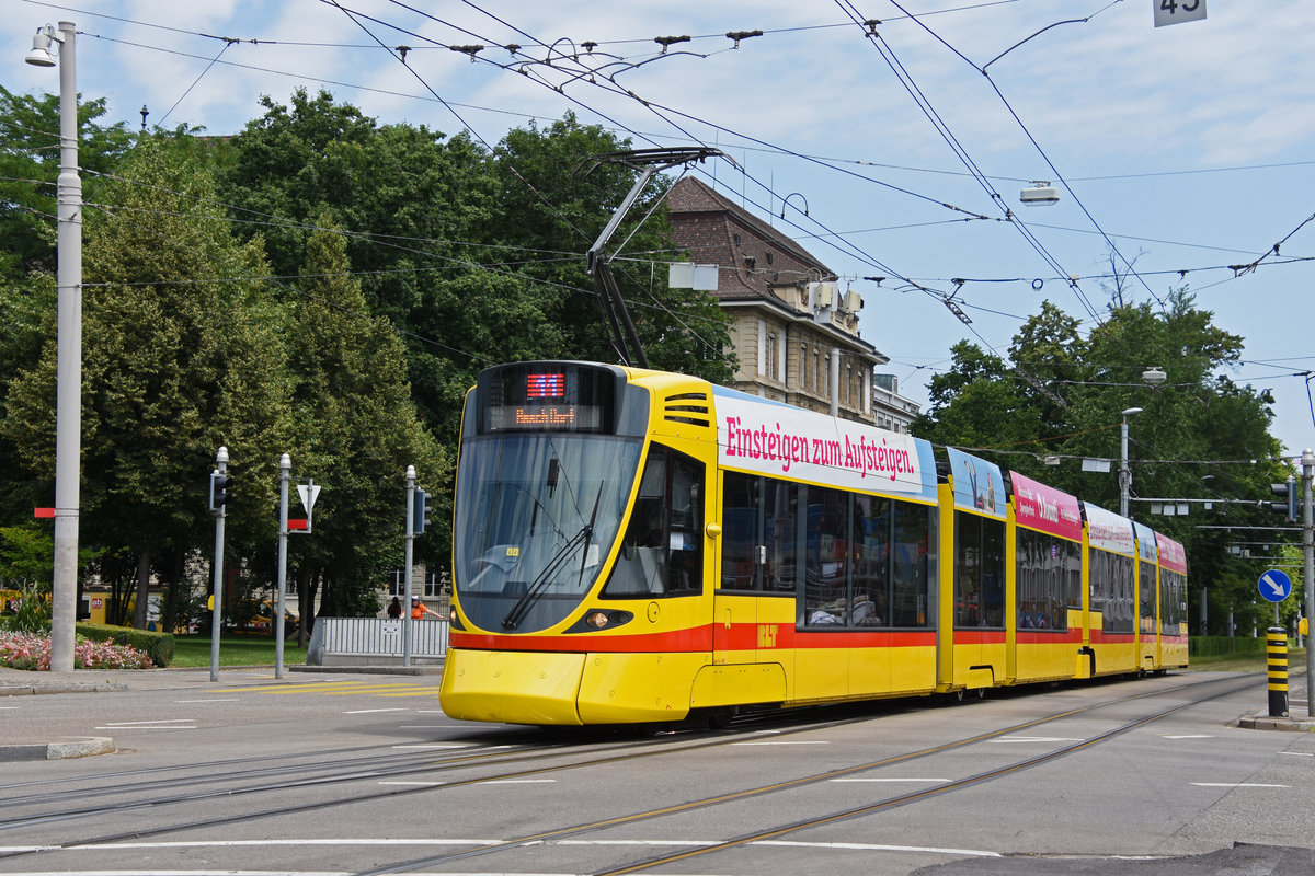Be 4/6 Flexity 6017 "PICCOLO", auf der Linie 15, fährt den Steinenberg hoch zur Haltestelle Bankverein. Die Aufnahme stammt vom 02.07.2019.