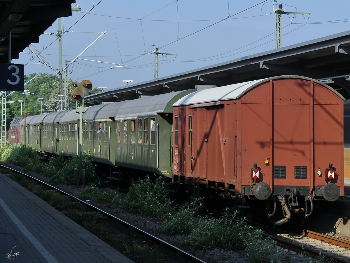 Ein Sonderzug nach Koblenz-Lützel beim Halt am Hauptbahnhof Wanne-Eickel. (Juni 2019)