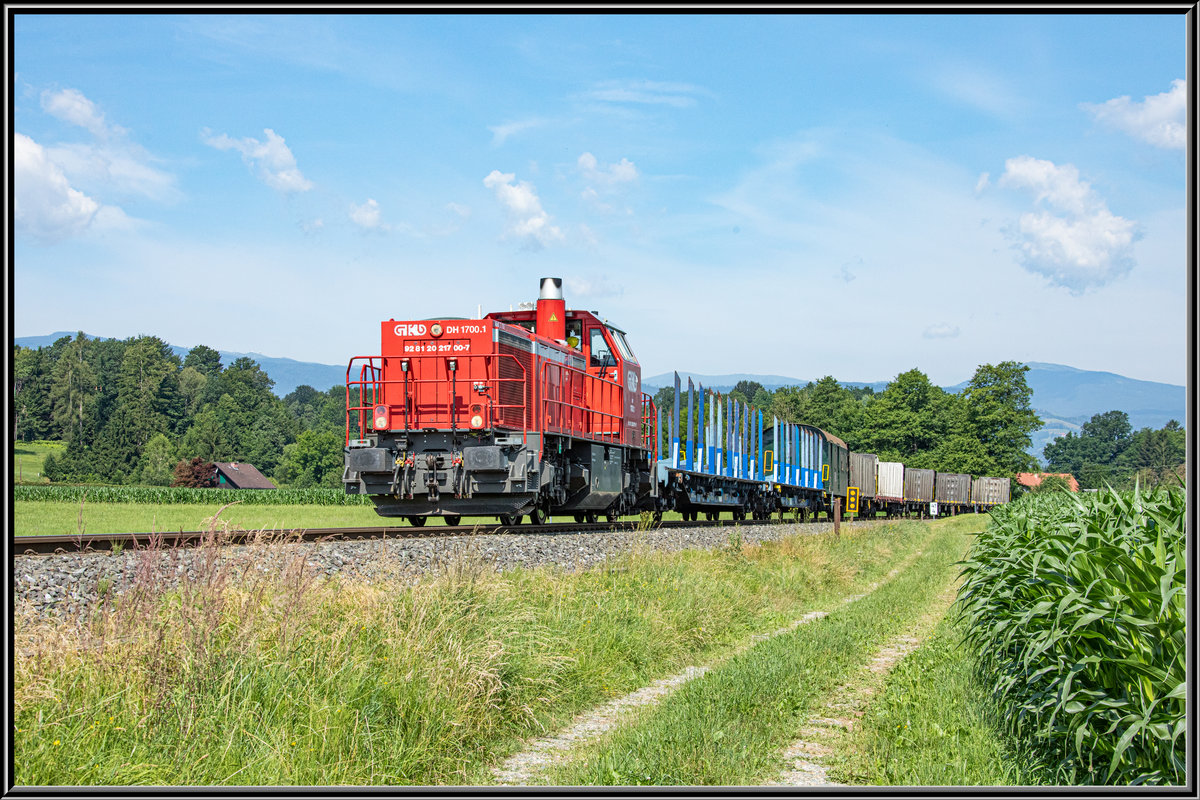 DH 1700.1 rauscht durch den Bahnhof Deutschlandsberg an diesem strahlenden 5.07.2019