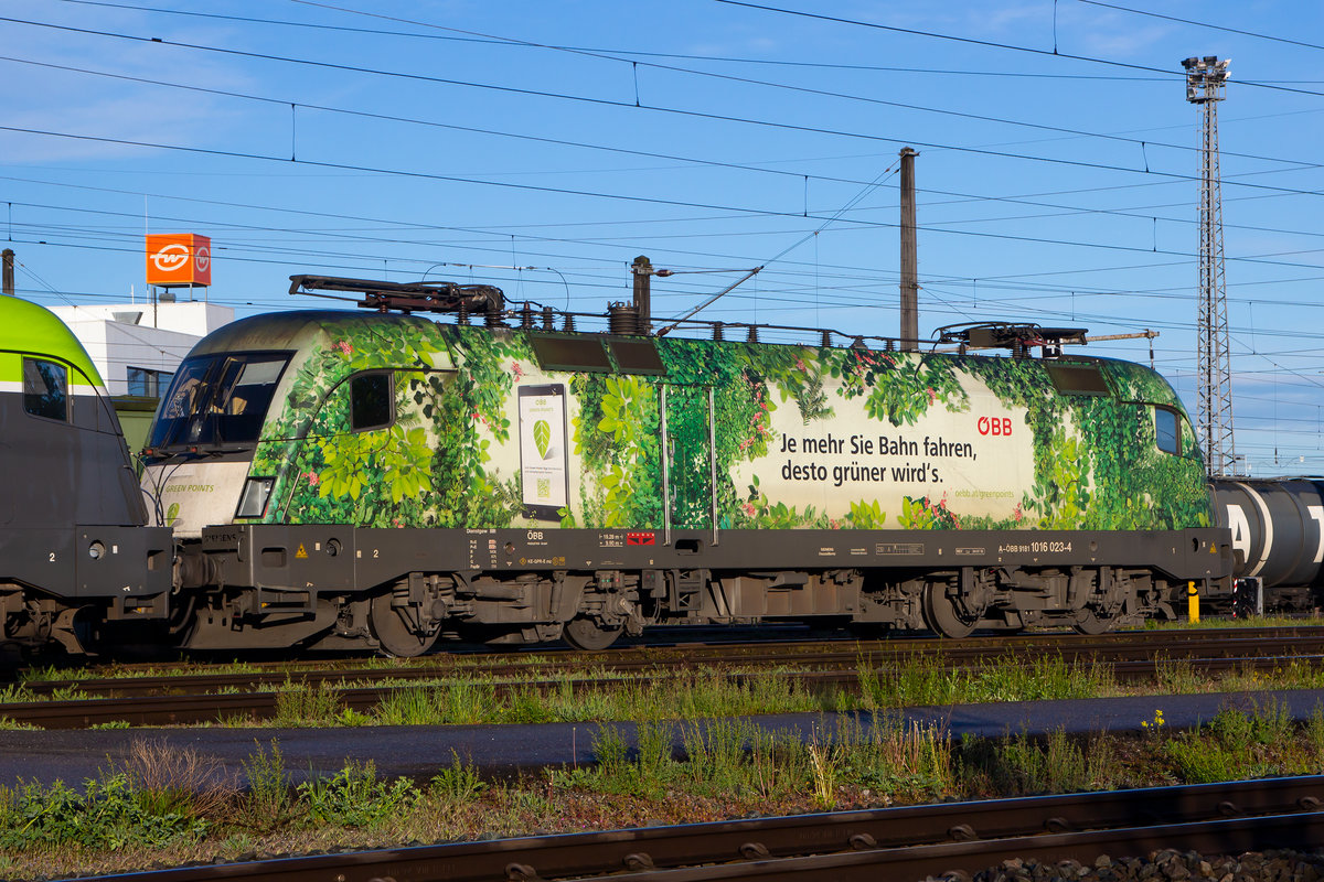 1016 023-4 in ihrer grünen Lackierung wartet an einem sonnigen Mai Morgen in Wolfurt auf ihren Tageseinsatz. 9.5.19