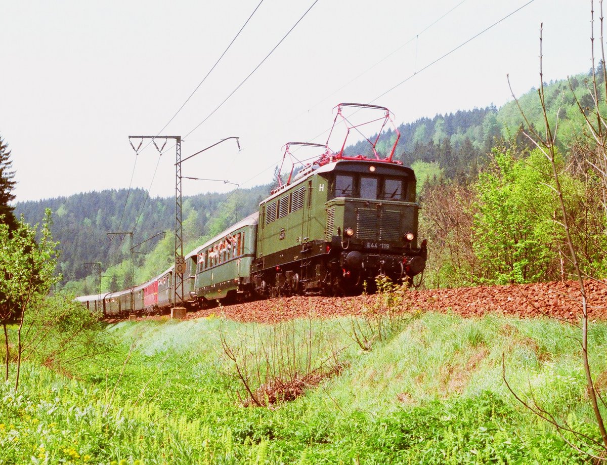 12.05.1988, Sonderfahrt mit 194 192-1 und E44 119 auf der Frankenwaldrampe von Lichtenfels nach Ludwigstadt. Die Strecke war noch eingleisig, hinter Lauenstein lag die Grenze zur DDR, der Zug endete hier und es gab ausreichend Zeit auszusteigen und zu fotografieren.