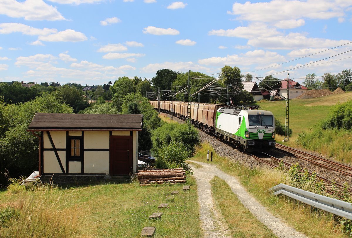 193 812 (SETG) zu sehen am 03.07.19 mit einem Hackschnitzelzug in Röttis.