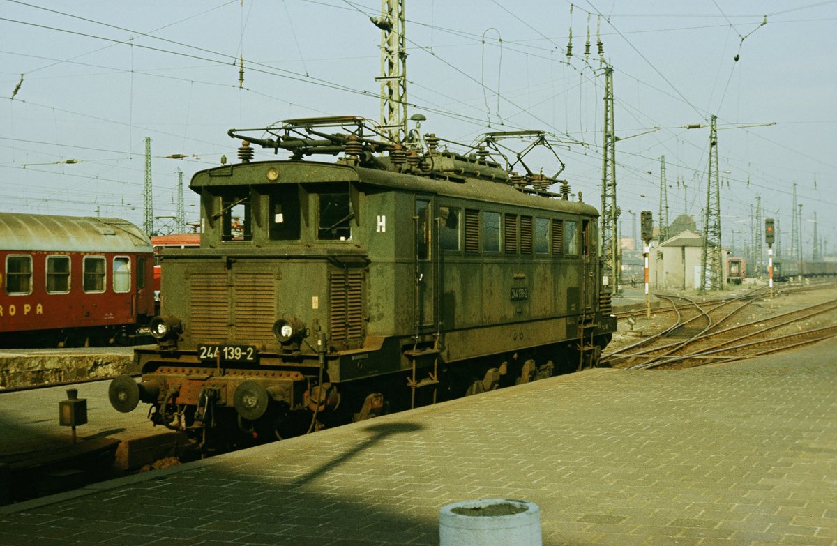 24.04.1986, Leipzig Hauptbahnhof, die E44 des Bw Leipzig-Engelsdorf steht noch im Plandienst und wartet auf die nächste Leistung. Die Lok wurde 1942 in Dienst gestellt. Ab 1955 war sie im Raum Halle - Leipzig unterwegs. z-Stellung 1991, Ausmusterung 4.9.1991. Eigentümer 2014: Eisenbahn- und Technikmuseum Prora/Rügen.