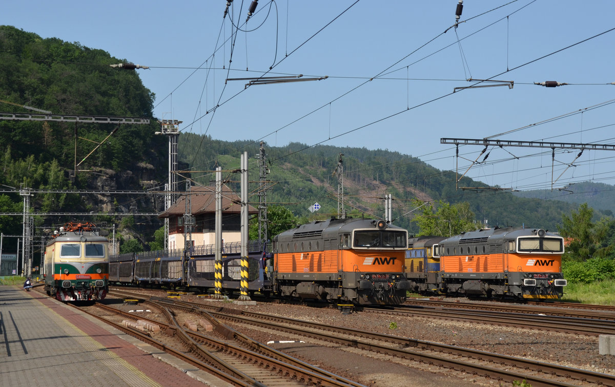 753 737 der AWT erreicht mit einem leeren Autozug am 12.06.19 Decin. Sie musste die Strecke für den nachfolgenden EC Richtung Prag frei machen.