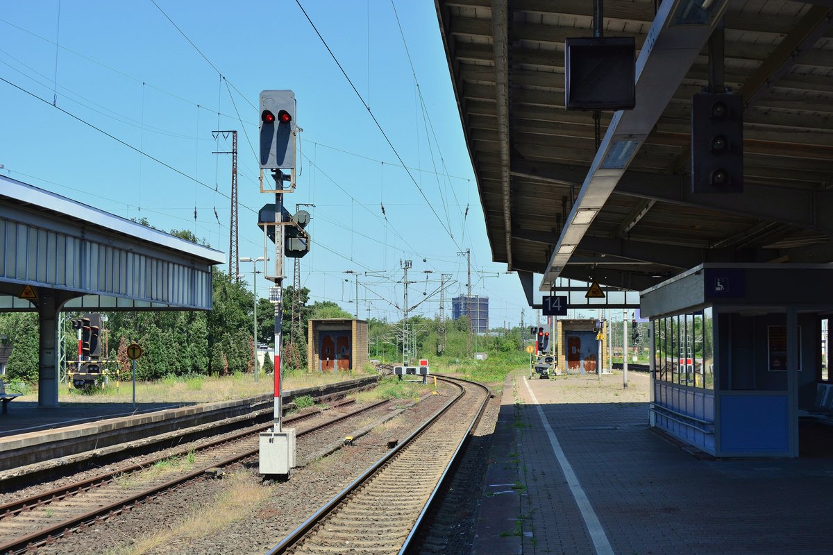 Blick auf das Ausfahrtsignal R014 in Gleis 14. Heute kann man von hier nur noch Richtung Oberhausen West fahren. Links sieht man den Prellbock des Stumpfgleises 15.