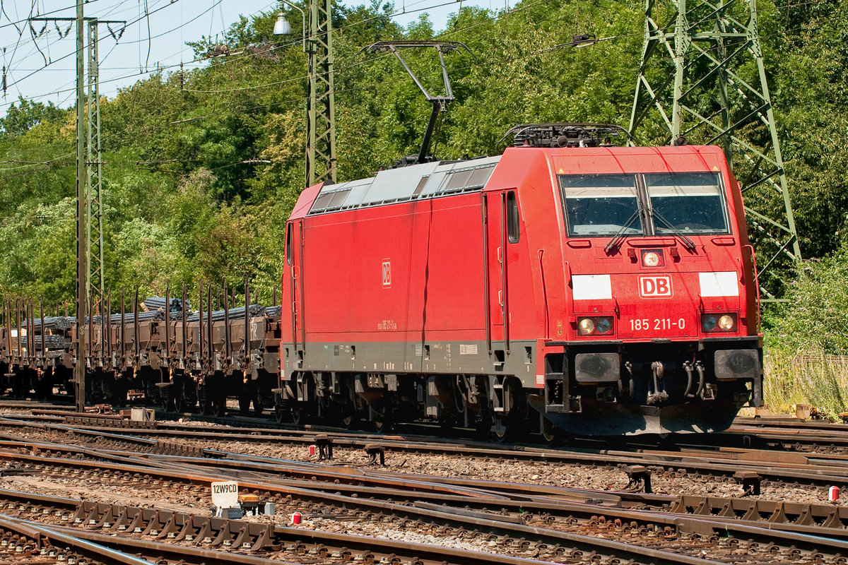 Die BR 185 durchfahrt in Porz-Gremberghoven. Aufgenommen am 29.6.2019.