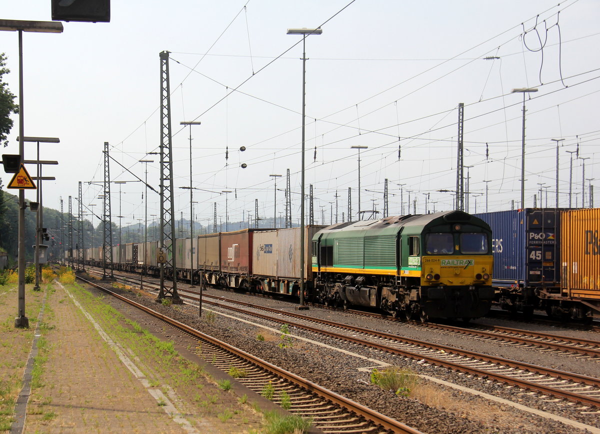 Die Class 66 266 024-9 von Railtraxx steht in Aachen-West mit einem langen Containerzug aus Köln-Eifeltor(D) nach Genk-Haven(B) und wartet auf die Abfahrt nach Belgien.