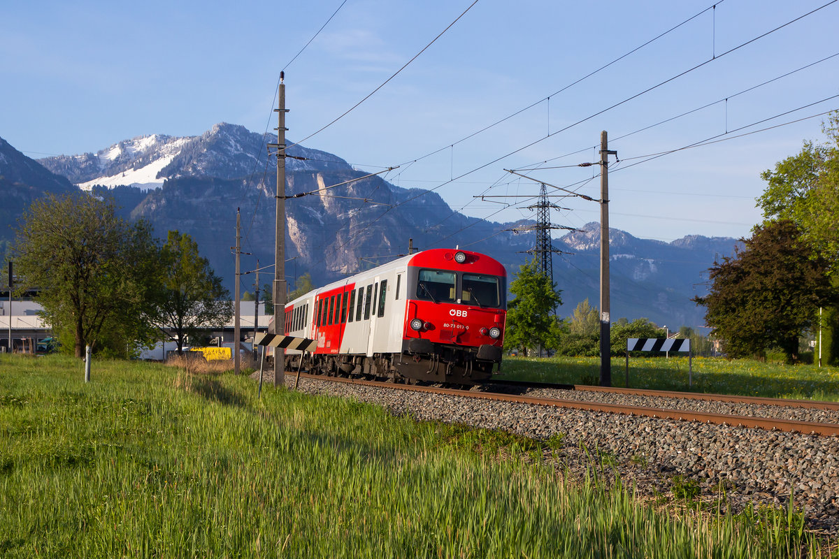 Frischer Schnee im Schuttannen am 7.5.19 und der Vorarlbergbahn im Vordergrund. Die morgendliche S-Bahn bespannt mit Stw. voraus gen Lindau. 80-73 017-0. Schwarzach,