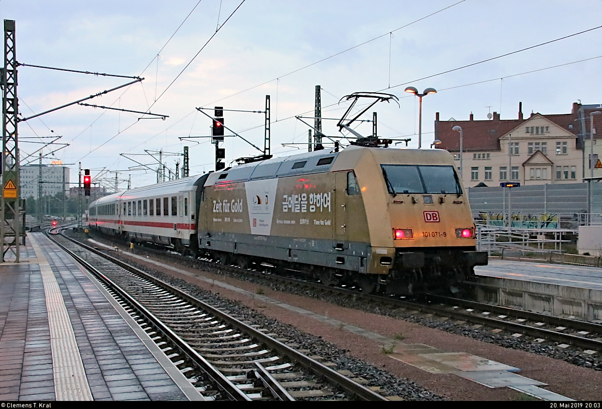 Seitliches Portrait von 101 071-9 "Zeit für Gold | 금을위한 시간 | 金の時間" als IC 2239 "Warnow" (Linie 56) von Magdeburg Hbf nach Leipzig Hbf, der Halle(Saale)Hbf auf Gleis 8 verlässt.