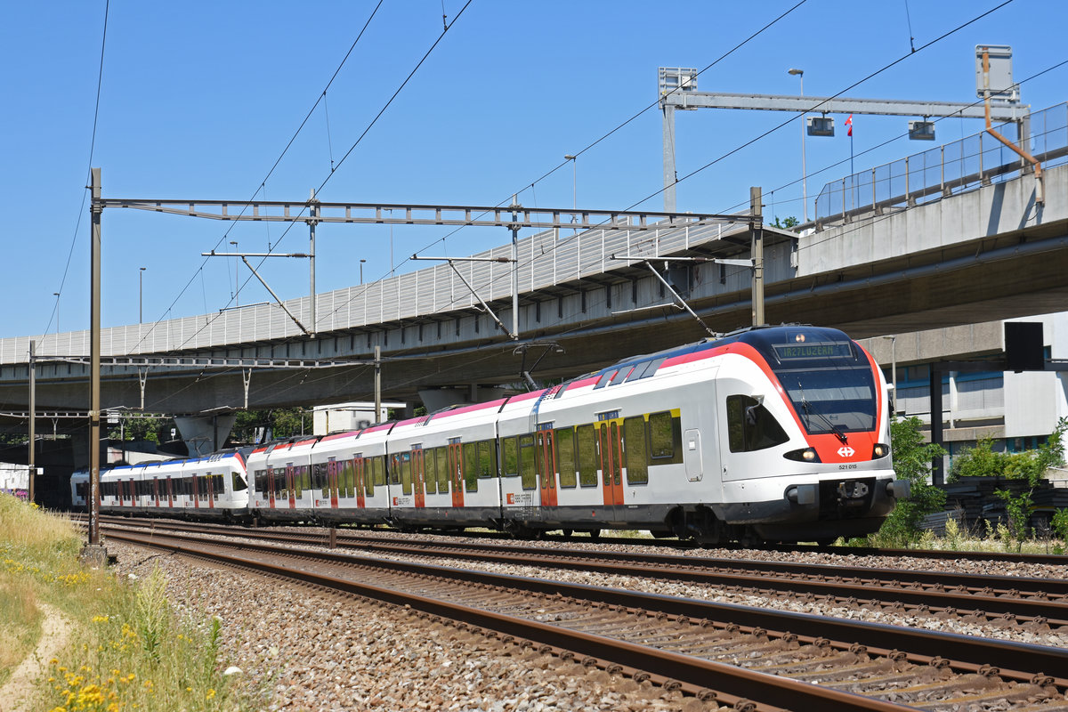 RABe 521 015, auf dem IR nach Luzern, fährt Richtung Bahnhof Muttenz. Die Aufnahme stammt vom 29.06.2019.