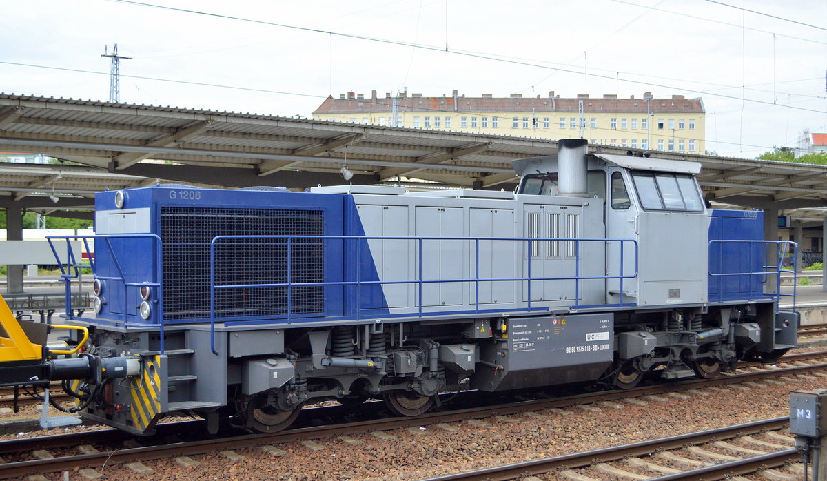 Seit 07.07.19 steht die LOCON G 1206 (NVR-Nummer: 92 80 1275 818-3 D-LOCON) mit einem Güterzug (Schienen-Transport) mit Drehgestell-Flachwagen von der Fa. vossloh auf einem der Durchfahrtgleise im Bahnhof Berlin-Lichtenberg abgestellt, 07.07.19
