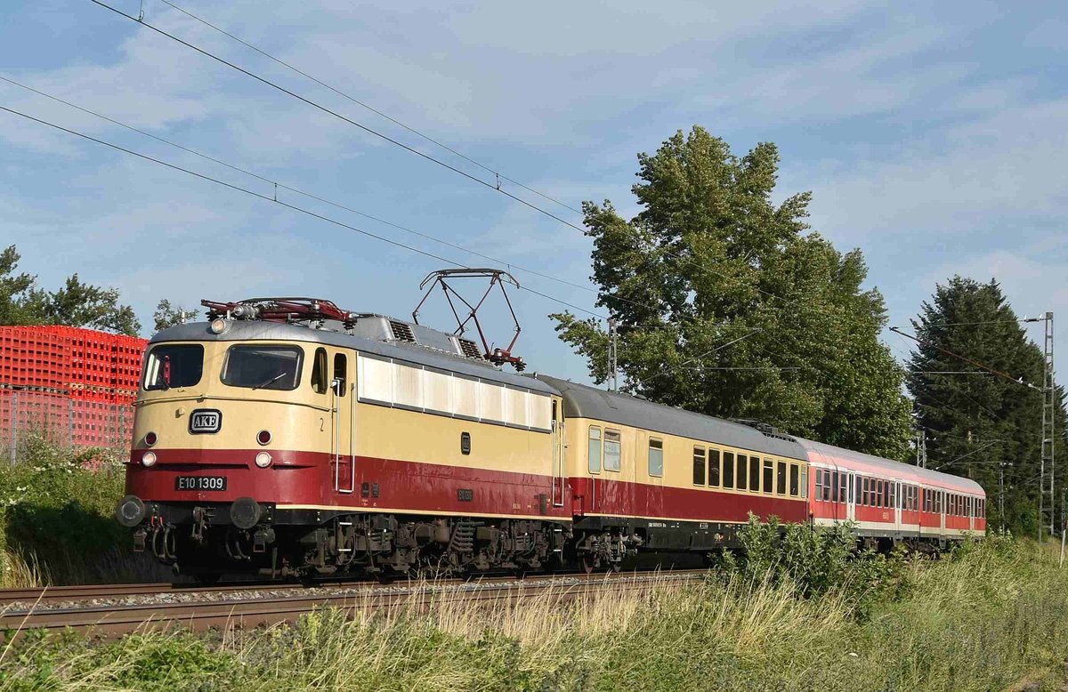 Was für eine wilde Fuhre, in Sinzig kommt die AKE E10 1309 mit einem TEE-Wagen und zwei N-Wagen die eher unansehlich aussehen gen Köln gefahren. 7.7.2019