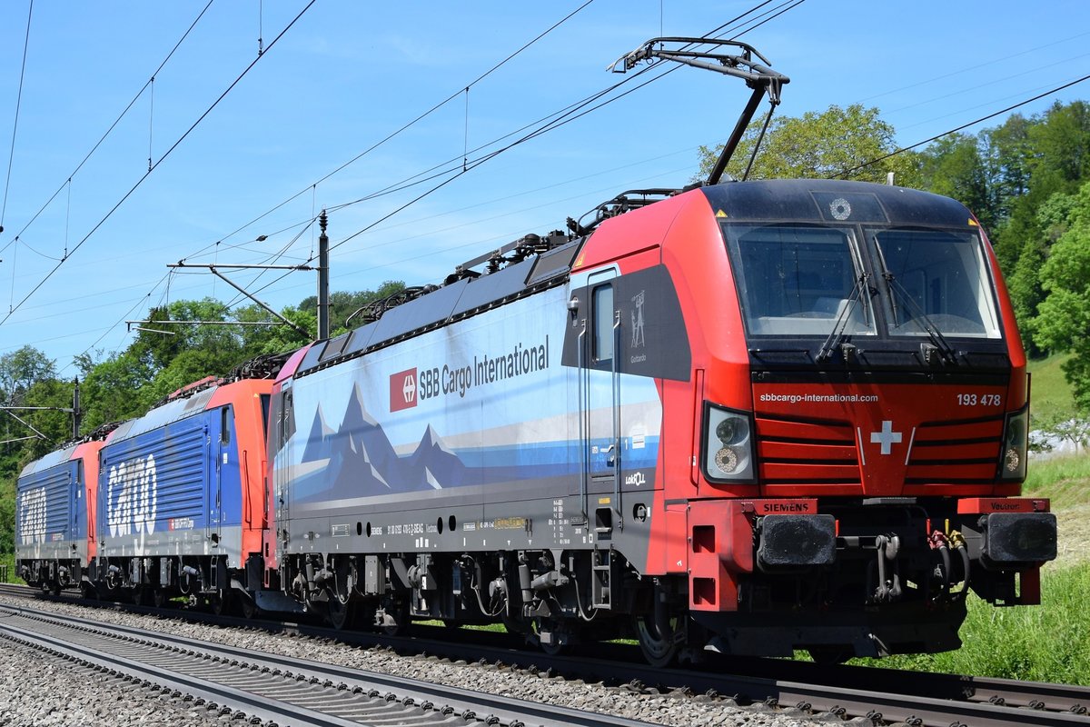 193 478 "Gottardo" hat am 01.06.2019 bei Umiken AG die beiden Loks 474 012 und 474 016 im Schlepp.