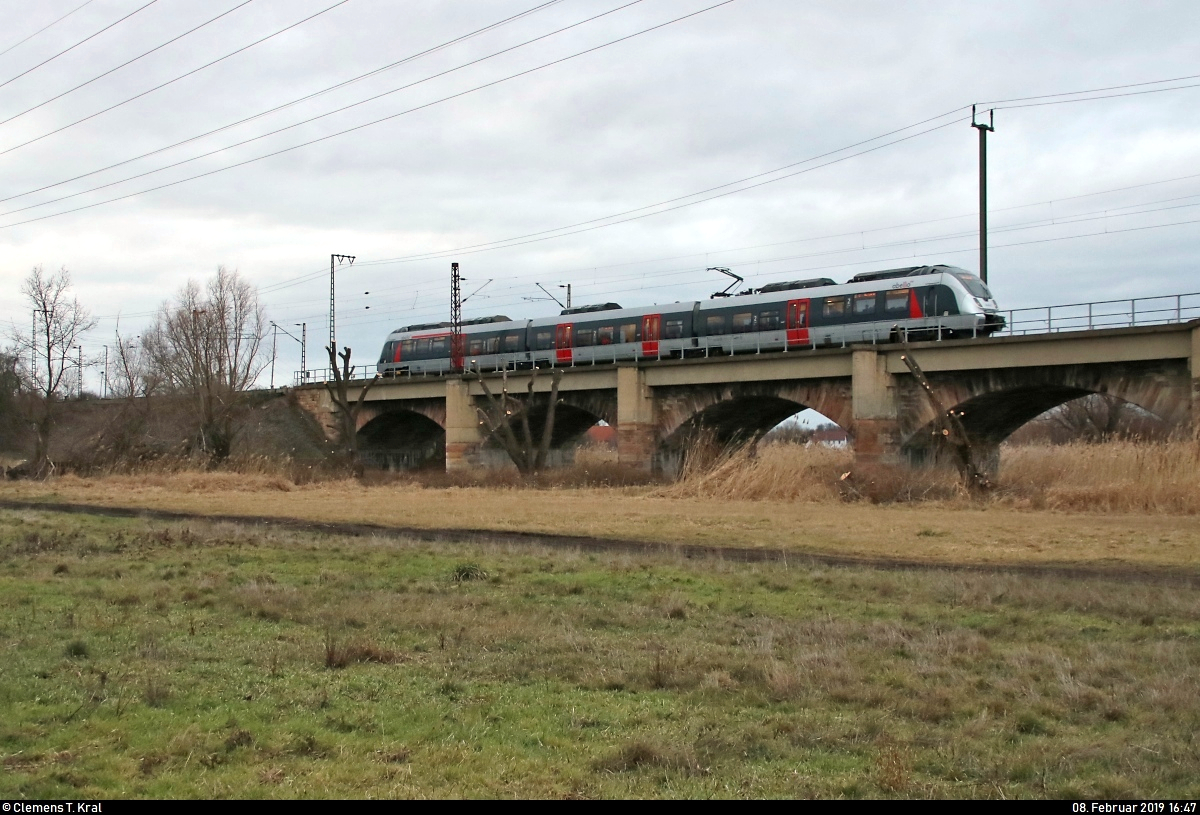 9442 ??? (Bombardier Talent 2) von Abellio Rail Mitteldeutschland als RE 74713 (RE9) von Kassel-Wilhelmshöhe nach Halle(Saale)Hbf Gl. 13a überquert die Saaleaue bei Angersdorf auf der Bahnstrecke Halle–Hann. Münden (KBS 590).