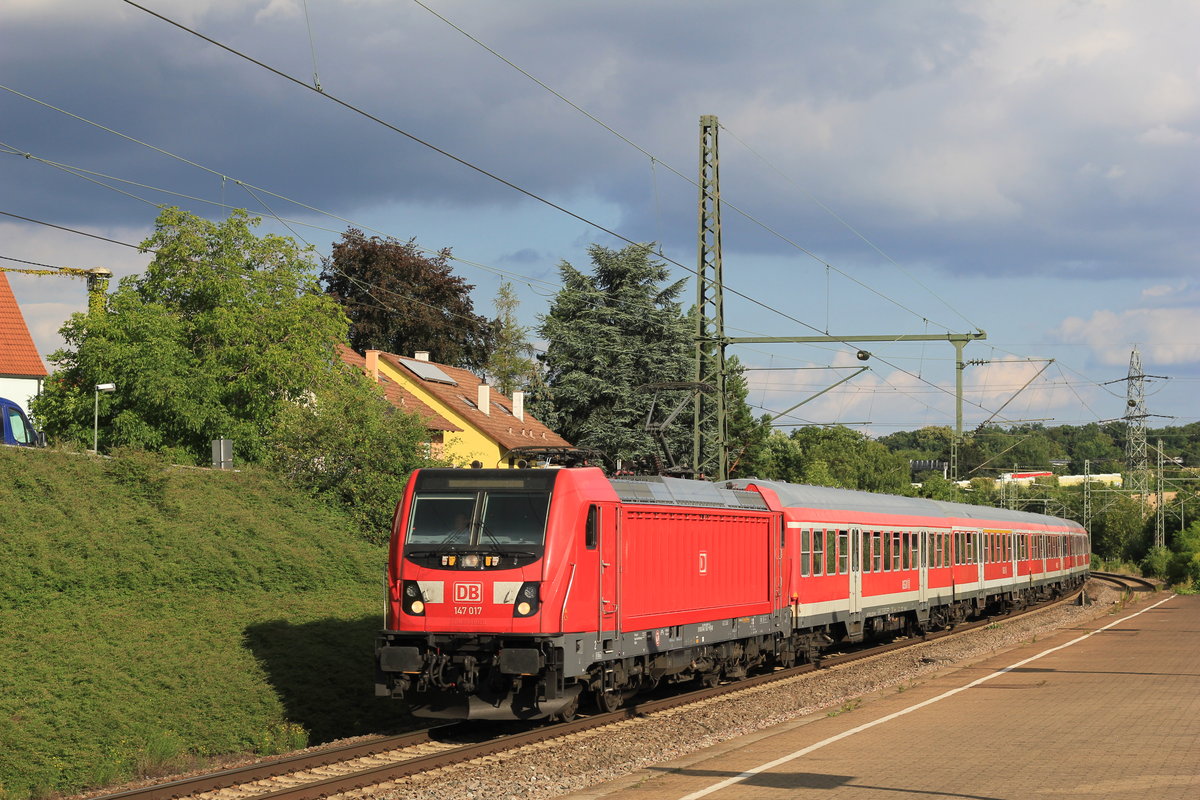 Am 11.07.2018 zieht 147 017 ihre RB nach Heilbronn durch den Bhf Asperg.