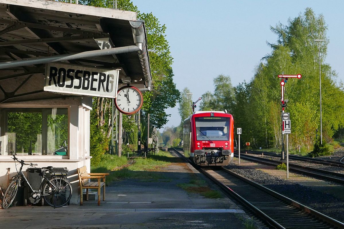 Auf der Fahrt von Kißlegg nach Sigmaringen durchfährt 650 114 am 02.05.2019 als RB 22803 den Bahnhof von Roßberg.