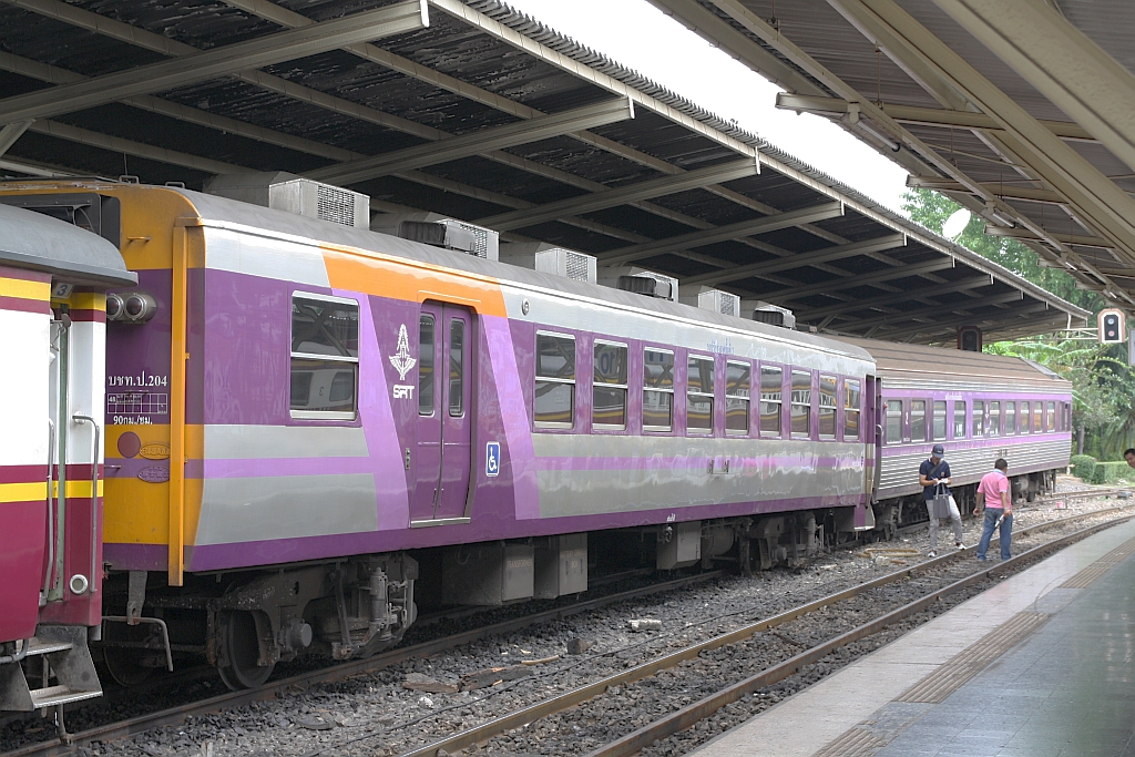 Der bei einem außergewöhnlichem Ereignis beim Verschub am 15.Mai 2018 in Bangkok Hua Lamphong entgleiste บชท.ป. 204 (บชท.ป. =ASC./Air-Conditioned Second Class Carriage).