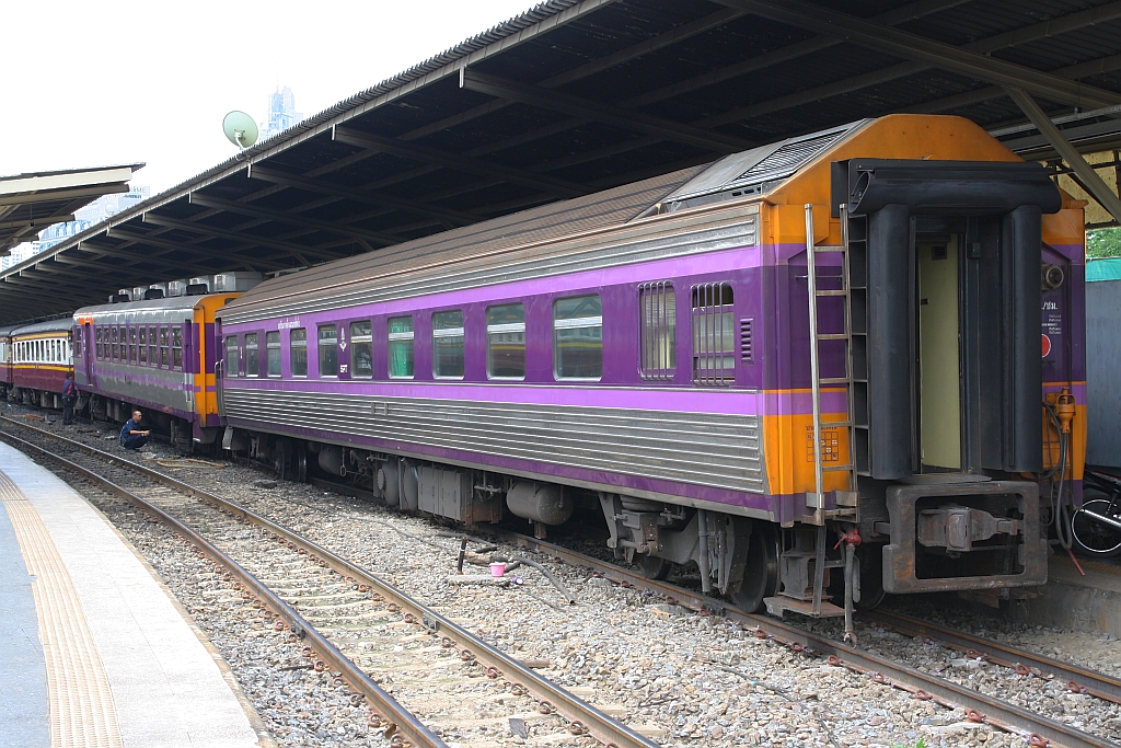 Der bei einem außergewöhnlichem Ereignis beim Verschub am 15.Mai 2018 in Bangkok Hua Lamphong entgleiste บนท.ป. 1018 (บนท.ป.=ANS./Air-conditioned Second Class Day & Night Coach).
