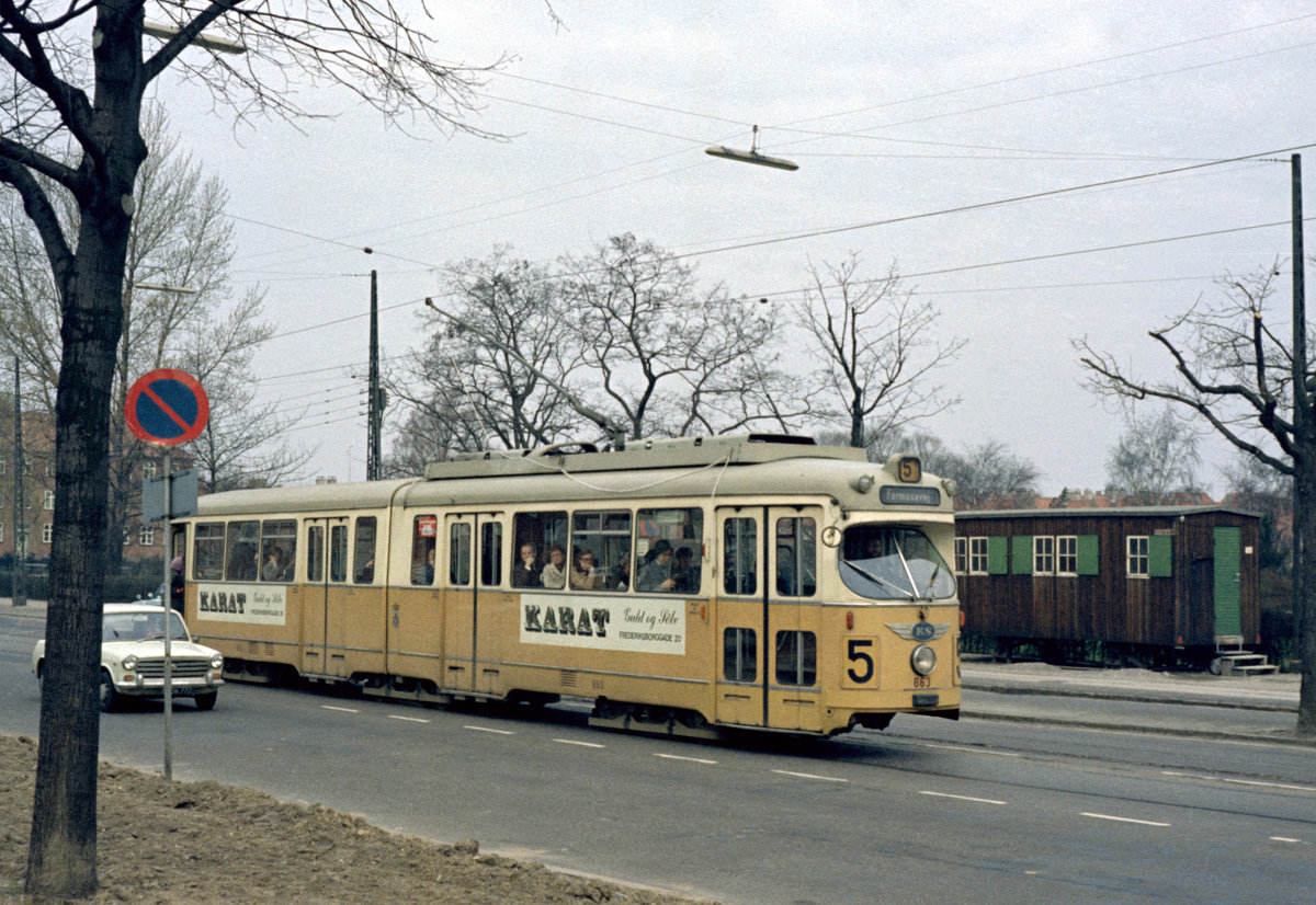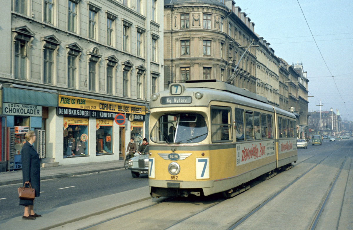 København / Kopenhagen Københavns Sporveje SL 7 (DÜWAG/Kiepe-GT6 852) København K, Frederiksborggade / Nørre Farimagsgade im April 1971. - Frederiksborg (in Hillerød, Nordseeland) ist ein Ortsname; das örtliche Schloss, Frederiksborg Slot / Schloss Frederiksborg, das im 17. Jh. vom dänischen König Christian IV im Stil der niederländischen Renaissance erbaut wurde, enthält Das Nationalhistorische Museum Dänemarks. - 'Farimagsgade' (= Far-i-mag(s)-gade) bedeutet eigentlich 'Fahr(e)-gemächlich-Straße'. - Scan eines Farbnegativs. Film: Kodak Kodacolor X.