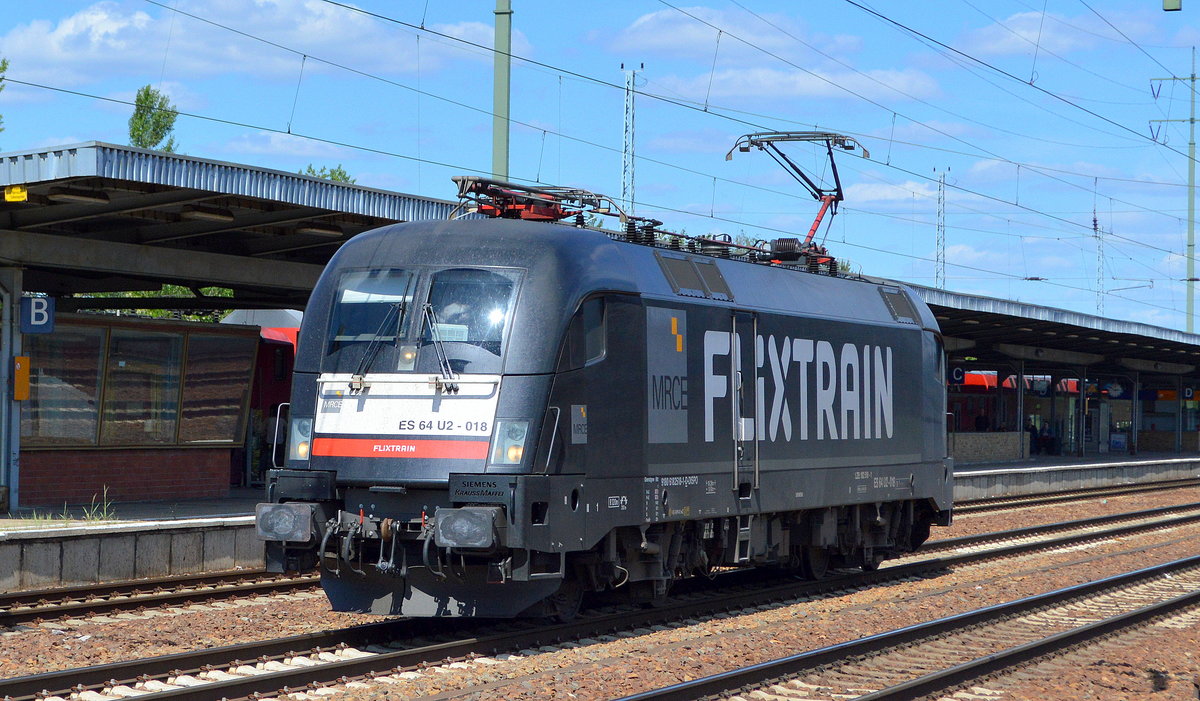 LEO Express GmbH/Flixtrrain mit dem MRCE Dispo Taurus "ES 64 U2-018" [NVR-Nummer: 91 80 6182 518-1 D-DISPO] am 29.05.19 Durchfahrt Bf. Flughafen Berlin-Schönefeld.