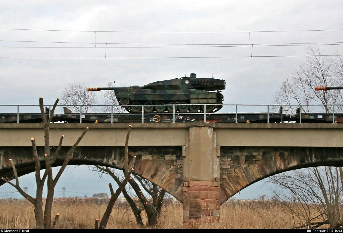 Blick auf einen mit einem Kampfpanzer "Leopard 2" der Bundeswehr beladenen Flachwagen der Gattung "Samms" (31 80 4864 ???-? D-DB) der DB, der mit 185 172-4 DB die Saaleaue bei Angersdorf auf der Bahnstrecke Halle–Hann. Münden (KBS 590) überquert.