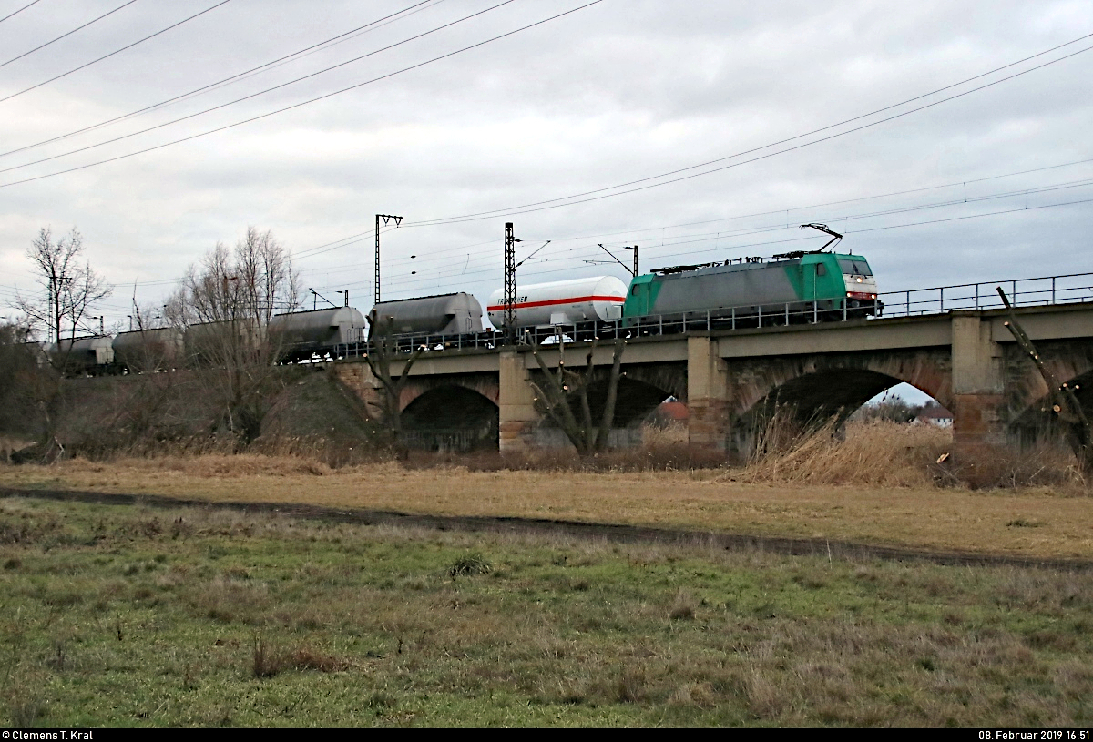 Seitliches Portrait von 270 003-4 (186 250) der Alpha Trains Belgium NV/SA, vermietet an die Transchem Sp. z o.o., mit Silowagen, die die Saaleaue bei Angersdorf auf der Bahnstrecke Halle–Hann. Münden (KBS 590) Richtung Halle (Saale) überquert.