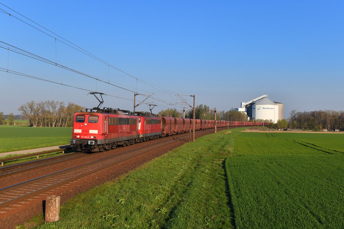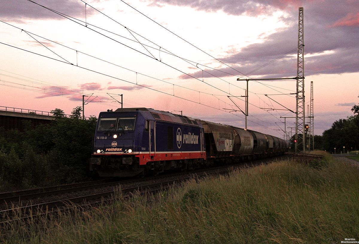 76 110  Raildox  mit Getreidezug zu Sonnenuntergang bei Porz Wahn am 12.06.2019