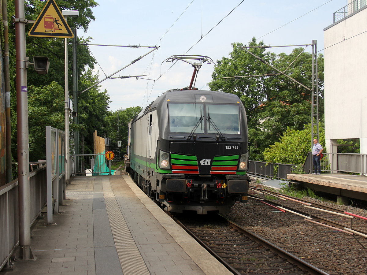 193 744 von der Wiener-Lokalbahnen-Cargo kommt aus Richtung Aachen-West mit einem langen KLV-Containerzug aus Genk(B) nach Trieste-Campo-Marzio(I) und fährt durch Aachen-Schanz in Richtung Aachen-Hbf,Aachen-Rothe-Erde,Stolberg-Hbf(Rheinland)Eschweiler-Hbf,Langerwehe,Düren,Merzenich,Buir,Horrem,Kerpen-Köln-Ehrenfeld,Köln-West,Köln-Süd. Aufgenommen vom Bahnsteig von Aachen-Schanz. Bei Sonnenschein am Nachmittag vom 4.6.2019.
