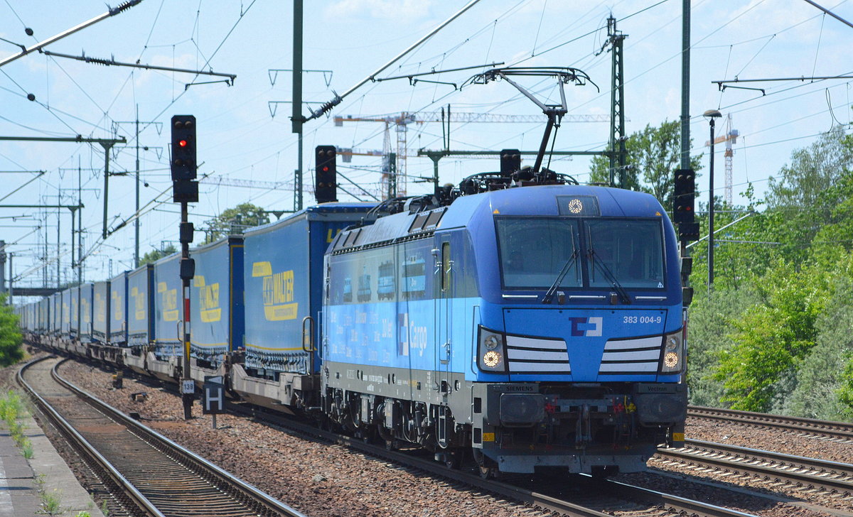 ČD Cargo a.s. mit  383 004-9  [NVR-Nummer: 91 54 7383 004-9 CZ-CDC] und KLV-Zug (LKW-WALTER Trailer) am 05.06.19 Bf. Flughafen Berlin-Schönefeld Richtung Rostock.