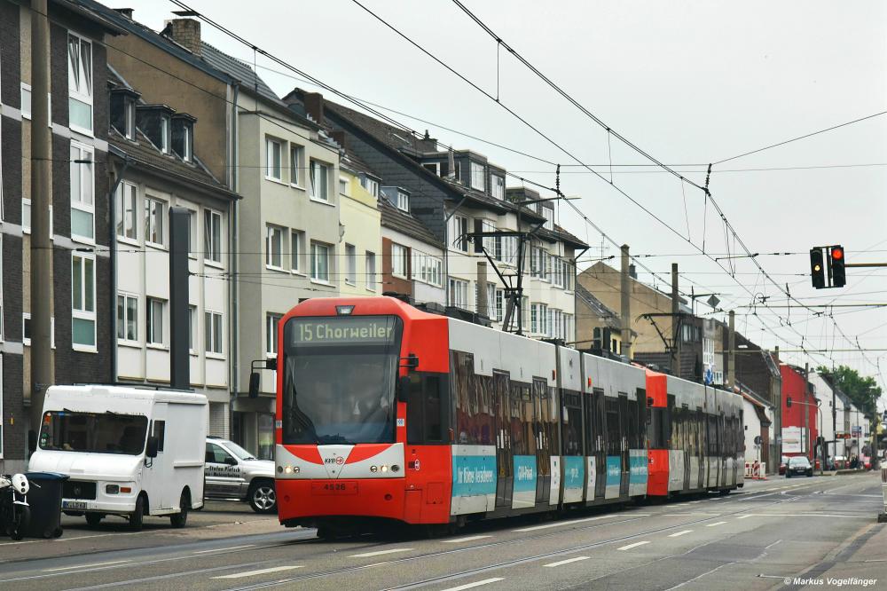 Als Sonderzug vom Düsseldorfer Hauptbahnhof in den Stadtteil Hamm überquert der GT8 2965 am 09.06.2019 den Stresemannplatz, den die Düsseldorfer Künstlerin Tita Giese 2007 mit Yuccapalmen und Autoreifen im Stil einer "mittelamerikanischen Verkehrsinsel" umgestaltete
